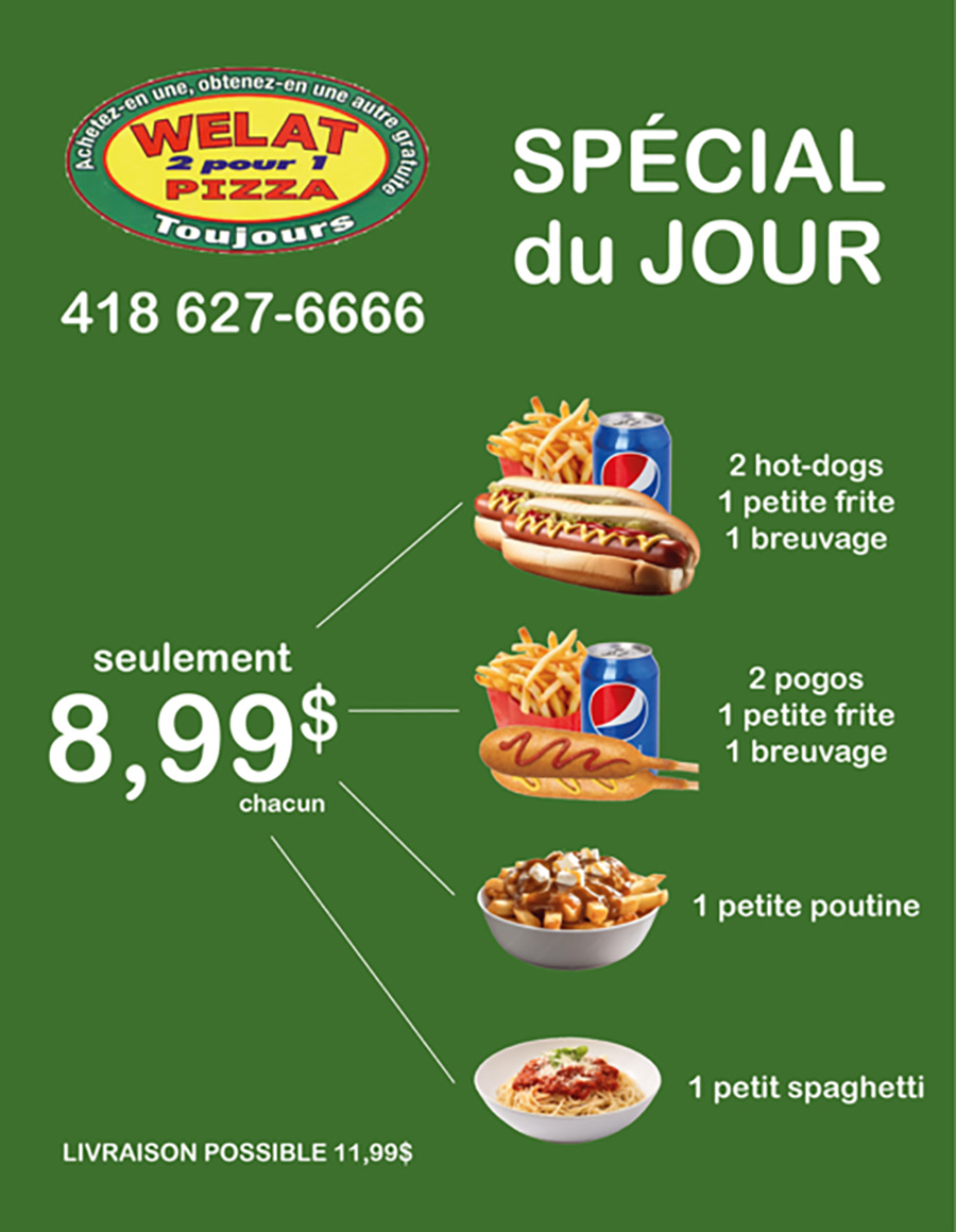 | 2 pizzas 9" 3 ing. au choix + 1 petite frite + 1 breuvage |